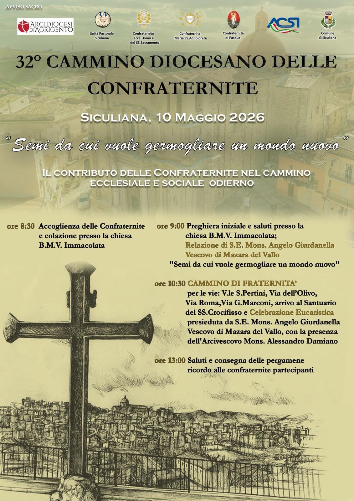 Il Centro Diocesano delle confraternite comunica il Cammino Diocesano a Siculiana il 10 maggio e attraverso il Cammino diocesano le confraternite si inserisco nel cammino diocesano in preparazione alla visita del santo Padre Leone XIV a Lampedusa.