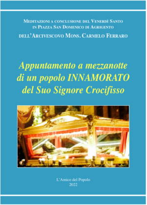 18:00, nel santuario dell’Addolorata di Agrigento, il libro dell’Arcivescovo Emerito di Agrigento (1988-2008), mons. Carmelo Ferraro: Appuntamento a mezzanotte di un popolo innamorato del suo Signore Crocifisso, edito da L’Amico del Popolo. Il libro contiene le meditazioni fatte in Piazza Municipio a conclusione del Venerdì Santo.