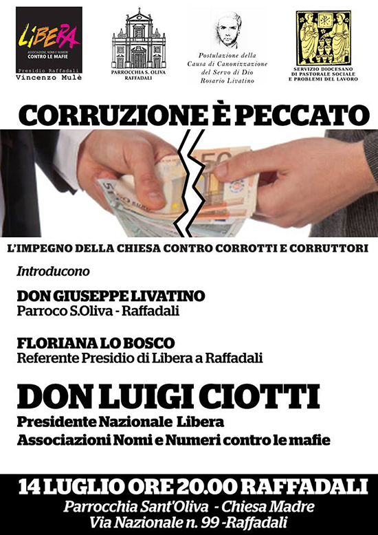 L’evento è promosso dalla Parrocchia S. Oliva, dall’Ufficio Diocesano di Pastorale Sociale, dal Presidio “Libera” di Raffadali e dalla Postulazione della Causa di canonizzazione del Servo di Dio Rosario Angelo Livatino.