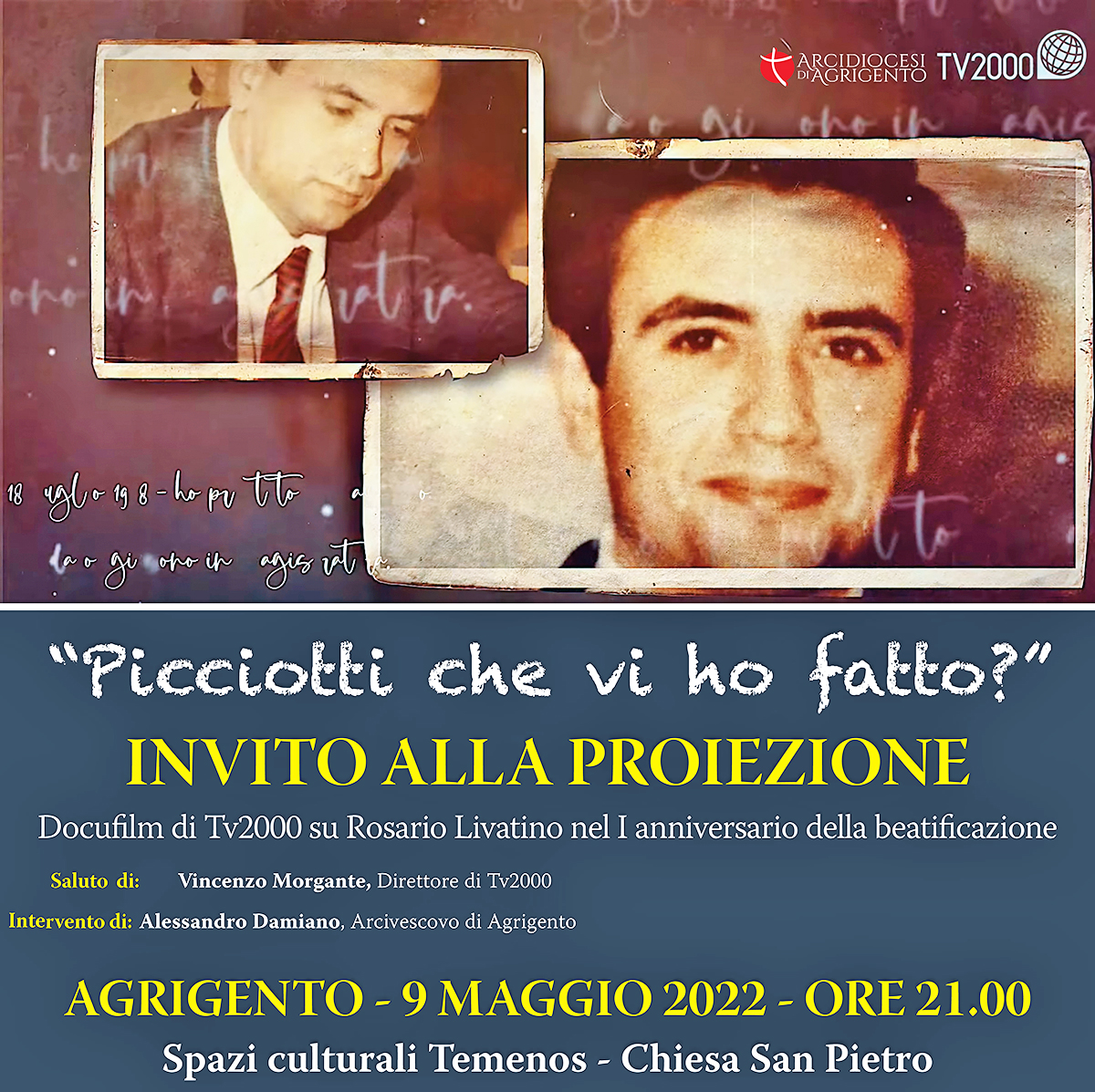 Lunedì 9 maggio 2022, primo anniversario della beatificazione del Giudice Rosario Angelo Livatino, l’Arcidiocesi di Agrigento e Tv2000, invitano alla proiezione del docufilm “Picciotti, che cosa vi ho fatto?”. La proiezione si terrà alle ore 21.00 presso gli Spazi Culturali Temenos, Chiesa San Pietro (via Pirandello, Agrigento).