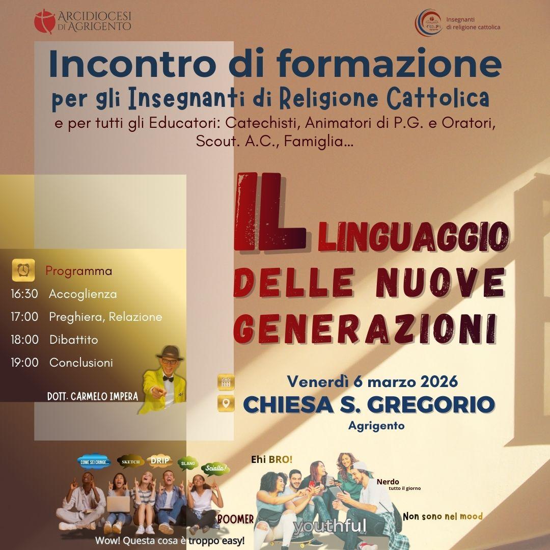 Archivio NewsInsegnamento della Religione CattolicaIRCIncontro di formazione per gli insegnanti di Religione Cattolica Venerdì 6 Marzo 20267 Febbraio 20267 Febbraio 2026 Parrocchia S. Gregorio Agrigento incontro di formazione per gli insegnanti di Religione Cattolica Venerdì 6 Marzo 2026