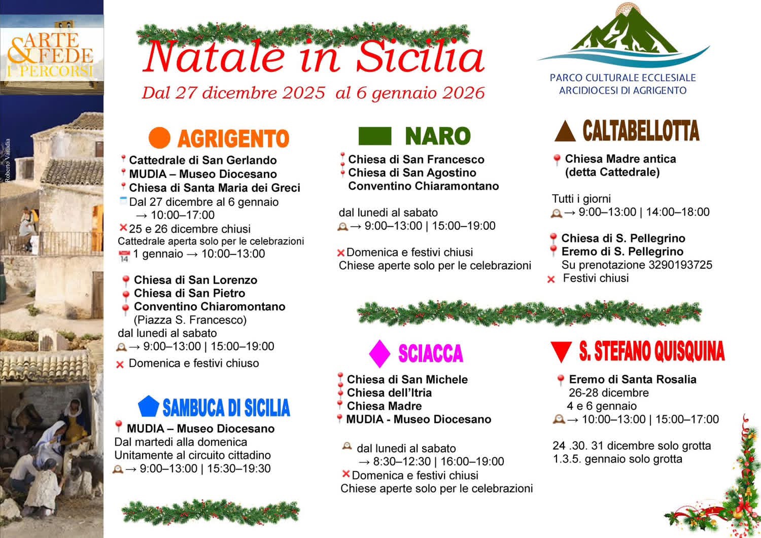 In questa pagina troverai una guida completa per scoprire orari e date per vivere una esperienza unica durante le festività, dal mare alla montagna, dalla splendida Cattedrale di Agrigento alla piccola grotta di Santo Stefano Quisquina, dal Mudia di Agrigento a quello di Sciacca e Sambuca. Città presepe in montagna a Caltabellotta e tra il Barocco di Naro. E oltre ai luoghi puoi visitare piccole comunità con l’atmosfera più bella del Natale: l’accoglienza.