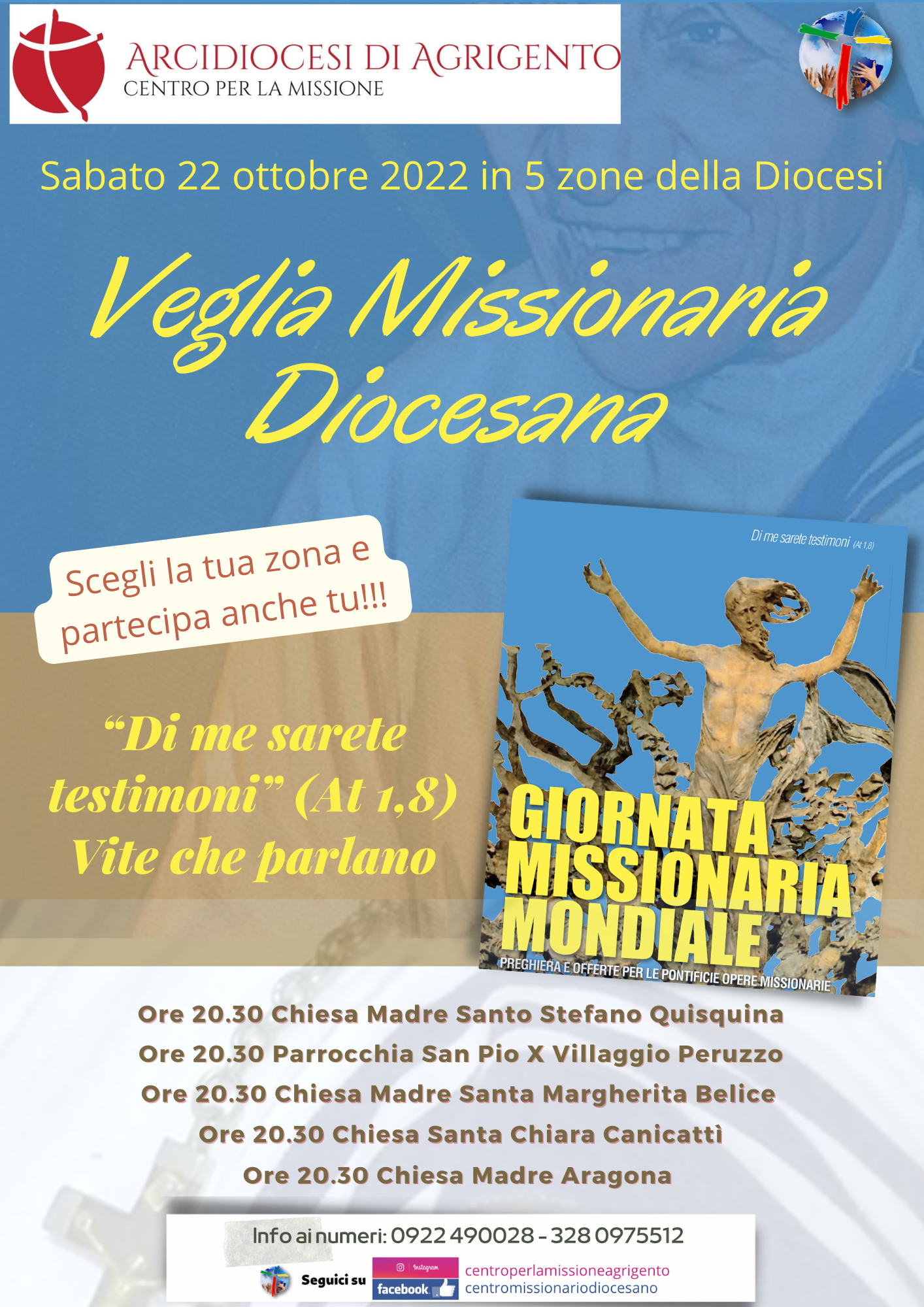 Il primo la veglia missionaria che sarà celebrata sabato 22 ottobre alle 20.30 contemporaneamente nelle 5 zone della Diocesi e dunque nella Chiesa Madre a Santo Stefano Quisquina; nella Chiesa Madre ad Aragona; nella Chiesa Madre a Santa Margherita Belice; nella Parrocchia San Pio X ad Agrigento e nella Parrocchia Santa Lucia in Santa Chiara a Canicattì.