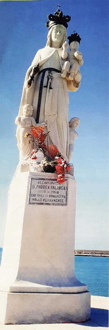 A volere la realizzazione dell’opera fu l’arciprete Andrea Falanga. La sua arcipretura è stata connotata e votata alla bellezza della Chiesa e alla devozione alla Madonna, volle fortemente la realizzazione e collocazione al Porto della statua della Madonna del Soccorso, dopo che egli stesso già alcuni anni prima si era molto prodigato perché la Chiesa Madre venisse proclamata Basilica minore, desiderio concretizzatosi l’8 maggio 1992. Ricordiamo per la storia che la Matrice già con l’arciprete Calogero Cusumano il 31 genaio1946 per decreto dell’arcivescovo mons. Giovanni Battista Peruzzo, era stata elevata a Santuario mariano,
