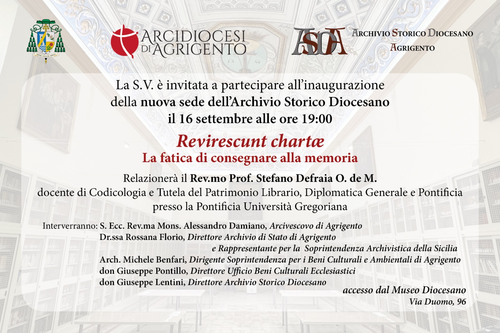 Venerdì 16 settembre 2022, alle ore 19:00, sarà inaugurata la nuova sede dell’Archivio Storico dell’Arcidiocesi di Agrigento che conserva i documenti prodotti dai vescovi e dalla Chiesa agrigentina dal 1510 fino al presente.