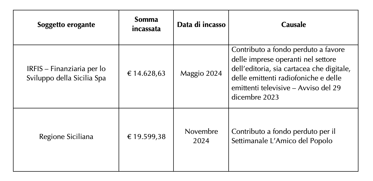 Come richiesto dall’art. 1, commi 125 – 129, della Legge 4 Agosto 2017, n. 124 ed in ossequio alle modifiche introdotte dall’art. 35 del D.L. 34/2019 (Decreto Crescita), convertito in legge dall’art. 1, comma 1, L. 58/2019, si comunica che l’Arcidiocesi di Agrigento Codice Fiscale 93006280841 ha ricevuto nel corso dell’anno 2024 i seguenti contributi/sovvenzioni dalla Pubblica Amministrazione: