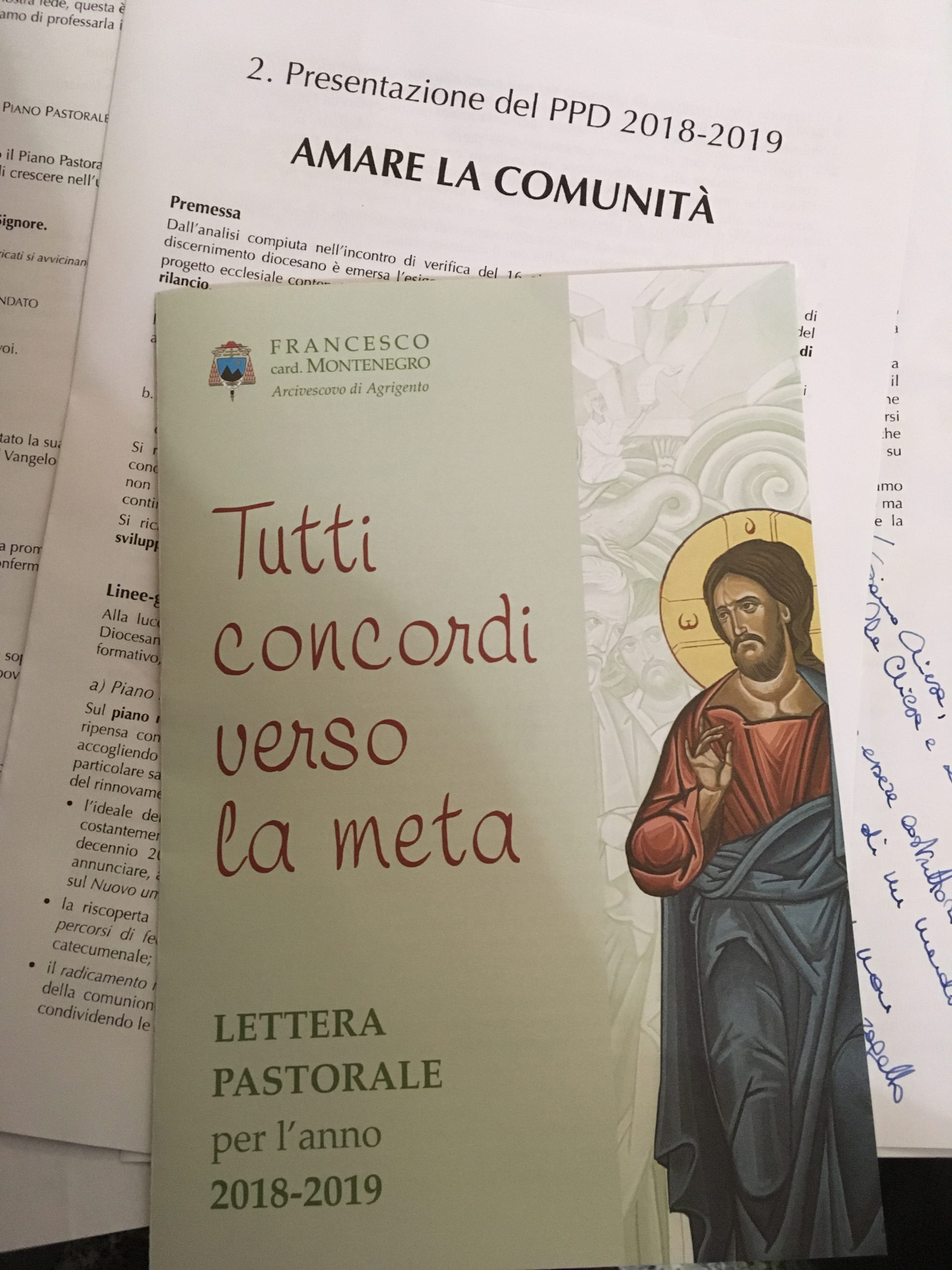 Nel corso dell’incontro don Giuseppe Agrò, vicario per la Pastorale, insieme a tutti i direttori dei Centri e dei servizi della Curia Arcivescovile, ha presentato il nuovo Piano Pastorale ed il percorso che ci attende come Chiesa Agrigentina. “«Tutti concordi verso la meta» – ha sottolineato don Agrò – esprime il bisogno di ritrovarsi per proseguire insieme il cammino. Esprime il bisogno di «riscoprire le scelte ecclesiali che abbiamo maturato ma non siamo ancora riusciti a condividere» e «recuperare i passi che abbiamo previsto ma non siamo ancora riusciti a compiere», come chiarisce l’Arcivescovo nella Lettera Pastorale di quest’anno”.