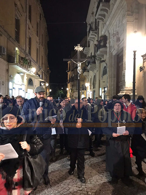 Vorrei invitarvi – ha detto ancora – a guardare anche gli occhi di Maria, la mamma. Chissà – si è chiesto –  quante volte si saranno rivolti alla croce da dove prendeva il Figlio. Quegli occhi hanno parlato di amore. ha cercato di consolare quel Figlio e i suoi occhi si sono incrociati con gli occhi del Figlio che senz’altro avrà guardato con gratitudine e con amore la mamma che è rimasta ferma lì ai piedi della croce straziata dal dolore. Ci sono, poi, – ha proseguito –  gli occhi di Giovanni e gli occhi delle donne. Occhi di compassione, occhi di tristezza ; occhi che continuano a guardare in alto, perché la croce è alta, occhi che cercavano di leggere quello che ci poteva essere nel cuore del Cristo. E anche in quei momenti finali in quegl’occhi avranno letto una storia d’amore anche se si chiudeva in quella maniera. Anche loro si saranno chiesti ‘perché?’. E guardando gli occhi del Cristo, penso, avranno avuto una risposta silenziosa. Teniamo gli occhi aperti – ha proseguito il cardinale – perché c’erano anche gli occhi lucidi di rabbia, di cattiveria, di malizia, dei soldati e della gente che qualche giorno prima aveva gridato “osanna” e poi “crocifiggilo”. E quegli occhi  ci sono ancora in giro. Ci sono quegli occhi che continuano a guardare gli altri, e a guardarli male; in essi ancora si legge malizia, cattiveria, prepotenza. Facciamo in modo – ha detto – che i nostri occhi restino lì, ai piedi della croce dalla parte del Cristo, di Maria e di Giovanni. Il nostro territorio, ha bisogno di occhi buoni, ha bisogno di occhi che sanno anche piangere. Dice Papa Francesco: “ chi non sa piangere non sa amare“. E allora – ha detto –  non abbiamo paura di guardare crocifisso perché mettendoci dalla sua parte ci mettiamo dalla parte dell’amore. E quella è la parte giusta, la parte che nessuno ci deve togliere. Teniamoci – ha proseguito –  a quella Croce e sappiamo che saremo sostenuti. Guardiamo attraverso quella Croce e sappiamo che c’è una luce che splende; è la luce della Pasqua. Sappiamo che il nostro grido, unito al Suo, diventa grido che arriva il cielo. Se noi sapremo stare dalla sua parte, sapremo raccogliere anche il grido degli altri, sapremo farci compagni. La via crucis continua. Chiediamo al Signore – ha concluso il cardinale – che ci dia dei buoni occhi che sappiano guardare in alto e lontano ma anche chi è a terra. La croce ci dice che nessuno è solo. È una storia da continuare, una bella storia; il Signore chiede a noi di essere quelli che continuano a scriverla e a scriverla con la penna dell’amore”.