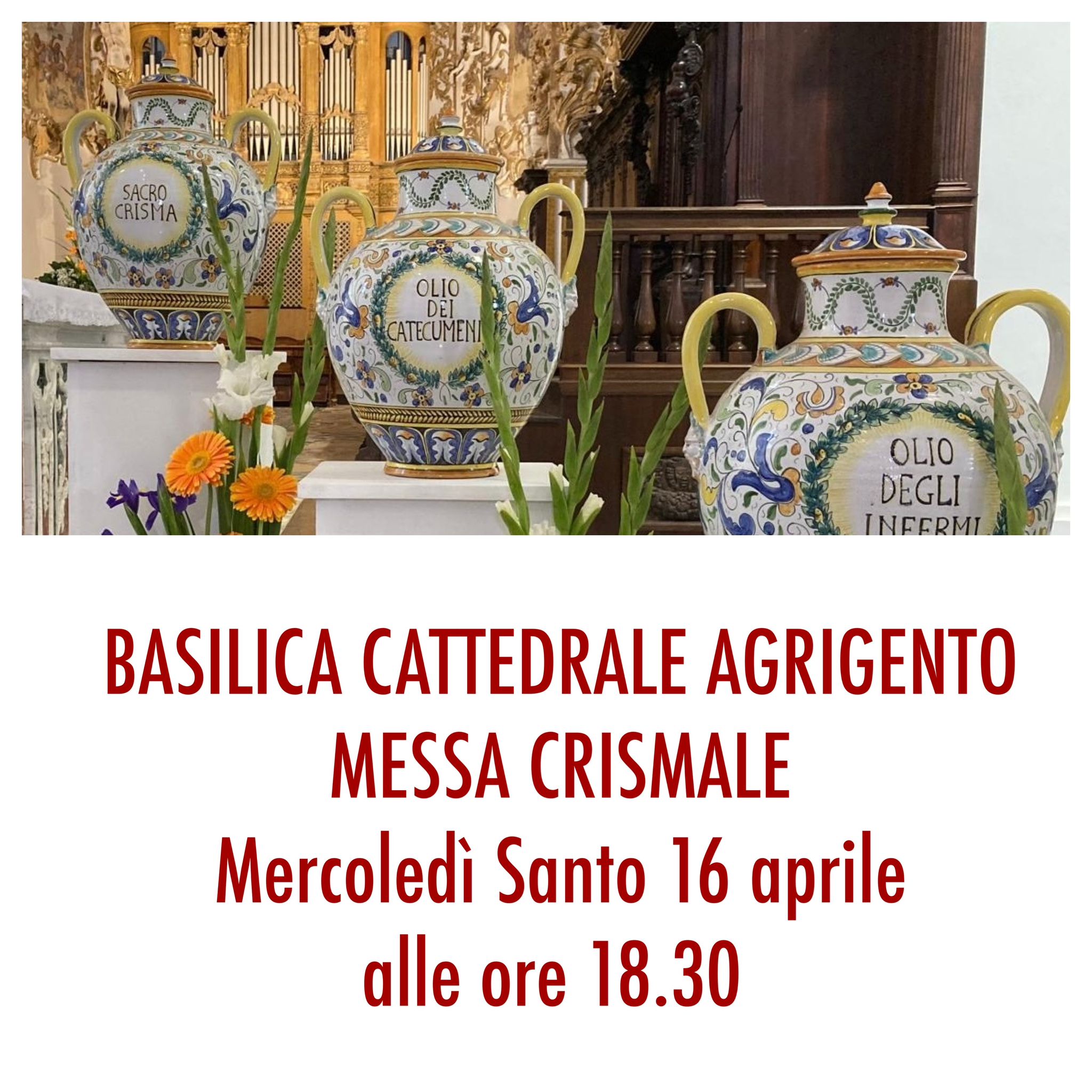 Messa Crismale mercoledì 16 Aprile Descrizione: Cattedrale – Ore 18,30 Celebrazione della messa crismale Inizio: 16/04/2025 18:30 Fine: 16/04/2025 19:30 Categorie: Arcivescovo Allegati: Settimana Santa Agrigento 2025PHOTO-2025-04-11-17-45-47